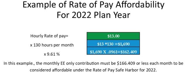 Rate of pay safe harbor avoids the retrospective analysis of each hourly employee’s W-2 wages because it allows you to assume a rate of 130 hours per calendar month times the employee’s hourly rate of pay. To be affordable, the employee’s required premiums for the employer’s lowest-cost self-only coverage cannot exceed 9.83% for 2021 (9.61% for 2022) of that rate (i.e., 130 hours times the employee’s hourly rate of pay). However, if an employee’s hourly rate of pay is reduced during the year, there are significant limitations on the use of this safe harbor and the calculation of employee premiums. Further, the rate of pay safe harbor is not available for any month that a non-hourly employee’s compensation is reduced, including due to a reduction in work hours. Also, as a practical matter, rate of pay safe harbor cannot be used for tipped employees, commissions or similar compensation arrangements where income fluctuates on a monthly basis.